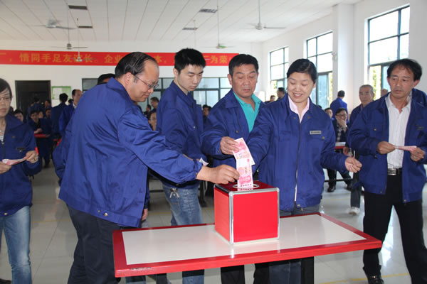 最后,董事長將公司總裝車間周志飛母親雙眼失明、妻子臥床不起加之他本人身帶殘疾的情況在會上進行了通報,號召全體員工獻愛心,自己帶頭捐款500元,公司副董事長程正紅、總經理陶力、黨委書記但漢興、公司其他副總和工會主席也率先捐款,全體參會人員在他們的帶領下,都涌躍捐出200、100元或50、20元不等的現金,共計捐款額6790元。